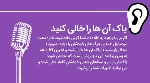هر بچه ای که در گاراژ کار می کند هم می داند شما نمی توانید یک باک بیشتر بنزین بزنید. اگر بنزین بیشتری بزنید، روی زمین می ریزد. به همین ترتیب، مغز شنونده ی شما همیشه پر از افکار، نگرانی ها و علایق خودش است. اگر ایده های خودتان را به مغز شنونده ای که پر از ذهنیات خودش است پمپاژ کنید، ترکیب آلوده ای به وجود می آید و بعد روی زمین می ریزد. اگر می خواهید ایده های ناب خودتان را تمیز و دست نخورده به باک او بریزید، اول باید آن باک را کاملا تخلیه کنید.