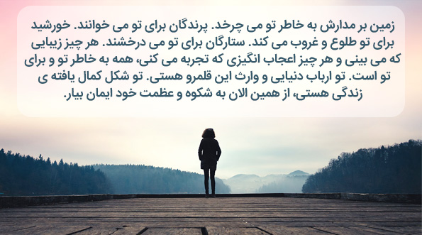 تمام ماجراها و رویدادها و لحظه هایی که بر تو گذشته، به این خاطر بوده تا تو را برای این لحظه و اکنون آماده کند. تصور کن با آن چه الان می دانی، از امروز به بعد چه کارهایی را می توانی انجام دهی. حالا می دانی که خودت خالق سرنوشت خود هستی. پس چه کارهای خوبی انجام می دهی؟ به چند نفر خیر و برکت می رسانی؟ برای چند نفر دعا می کنی؟ از لحظه هایت چگونه استفاده می کنی؟ هیچ کس نمیتواند کار تو را انجام دهد. کسی نمی تواند دعا یا ترانه ی تو را بخواند، کسی نمی تواند داستان تو را بنویسد. هر کسی هستی، از همین الان شروع کن!
