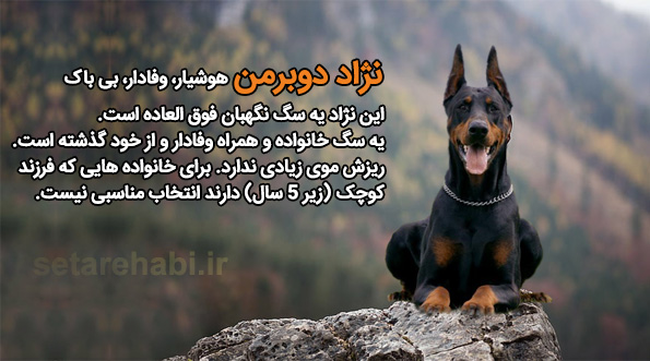 دوبرمن با داشتن بدنی قدرتمند و هوش بالا یکی از بهترین نژادهای بی باک در بین بهترین سگ های باهوش، شجاع و محافظتی دنیا شناخته می شود. این نژاد تمایل دارد فقط با یک نفر احساس نزدیکی کند وآن را دوست و صاحب خودش بداند و به همین علت مناسب ترین انتخاب برای افراد مجرد و خانواده هایی که دارای فرزند کوچک نیستند می باشد.