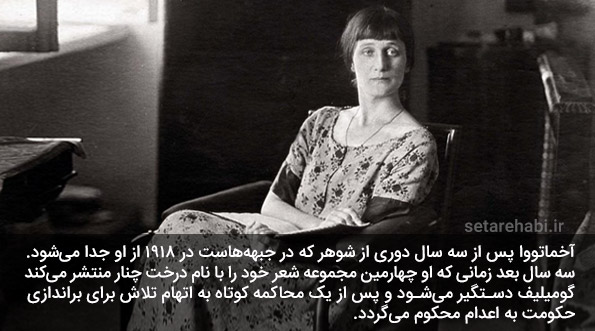 آخماتووا پس از سه سال دوری از شوهر که در جبهههاست در 1918 از او جدا میشود. سه سال بعد زمانی که او چهارمین مجموعه شعر خود را با نام درخت چنار منتشر میکند گومیلیف دستگیر میشود و پس از یک محاکمه کوتاه به اتهام تلاش برای براندازی حکومت به اعدام محکوم میگردد.