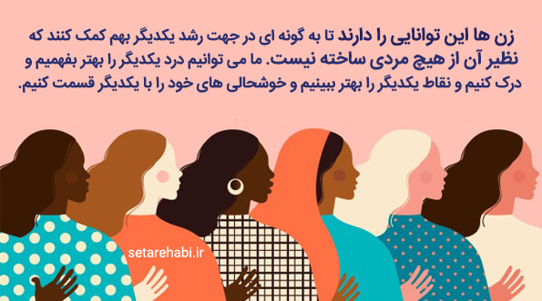 زن ها غالبا بزرگ ترین منبع حمایتی خود که همان زن های دیگر می باشند را فراموش می کنند. هنگامی که زن های دیگر را به چشم رقیبانی که احتمال دارد مردان ما را از ما بدزدند، ببینیم، در حق خود ظلم کرده ایم. زن ها این توانایی را دارند تا به گونه ای در جهت رشد یکدیگر بهم کمک کنند که نظیر آن از هیچ مردی ساخته نیست. ما می توانیم درد یکدیگر را بهتر بفهمیم و درک کنیم و نقاط یکدیگر را بهتر ببینیم و خوشحالی های خود را با یکدیگر قسمت کنیم. چرا که زن ها همگی نگین های مختلف جواهر واحدی هستند که عبارت است از روح مونث و زنانه. هر چه عشق و حمایت بیشتری از زن های دیگر دریافت کنید، کمتر برای ارضای تمامی نیازهای خود به مرد زندگیتان متکی و وابسته خواهید بود.