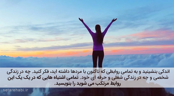 اندکی بنشینید و به تمامی روابطی که تاکنون با مردها داشته اید، فکر کنید. چه در زندگی شخصی و چه در زندگی شغلی و حرفه ای خود. تمامی اشتباه هایی که در یک یک این روابط مرتکب می شوید را بنویسید.