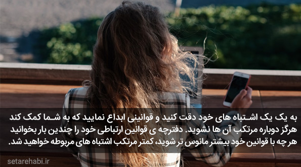 سعی کنید لیست اشتباهاتتان طولانی باشد، تا به شما کمک کند بر روی اکثر اشتباه های خود تمرکز کنید. به یک یک اشتباه های خود دقت کنید و قوانینی ابداع نمایید که به شما کمک کند هرگز دوباره مرتکب آن ها نشوید. دفترچه ی قوانین ارتباطی خود را چندین بار بخوانید. هر چه با قوانین خود بیشتر مانوس تر شوید، کمتر مرتکب اشتباه های مربوطه خواهید شد.