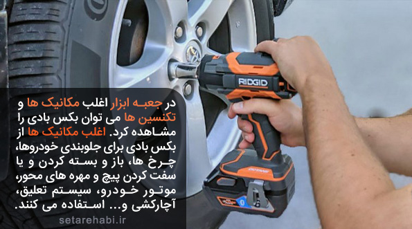 بکس بادی جزو ابزارهای فوق العاده قدرتمند و کارآمد برای باز و بسته کردن انواع پیچ و مهره است. این ابزار با نام های دیگری از قبیل ایمپکت بادی و آچار پنوماتیک نیز در صنعت شناخته شده اند. تقریبا در جعبه ابزار اغلب مکانیک ها و تکنسین ها می توان بکس بادی را مشاهده کرد. اغلب مکانیک ها از بکس بادی برای جلوبندی خودروها، چرخ ها، باز و بسته کردن و یا سفت کردن پیچ و مهره های محور، موتور خودرو، سیستم تعلیق، آچارکشی و... استفاده می کنند.