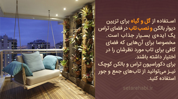 استفاده از گل و گیاه برای تزیین دیوار بالکن و نصب یک تاب دو نفره یکی از بهترین ایده ها برای کسانی است که فضای کافی را در اختیار داشته باشند.