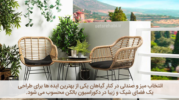 انتخاب میز و صندلی در کنار گیاهان یکی از بهترین ایده ها برای طراحی یک فضای شیک و زیبا در دکوراسیون بالکن محسوب می شود. گیاهان به فضای تراس و به تبع آن فضای خانه، روح میبخشند و باعث ایجاد حس طراوت و تازگی می شوند. اگر بالکن کوچک دارید حتما از گل و گیاه برای تزیین بیشتر آن استفاده کنید.