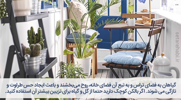 در طی سال های اخیر به علت گران بودن زمین و همچنین افزایش جمعیت شهری اغلب خانهها از داشتن حیاط و فضای باز بیبهرهاند و اغلب افراد در خانههای کوچک و آپارتمانی زندگی می کنند. در خانه های آپارتمانی داشتن تراس، بالکن و ایوان حتی اگر خیلی کوچک هم باشد برای ما غنیمت است.