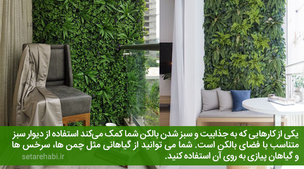 یکی از کارهایی که به جذابیت و سبز شدن بالکن شما کمک میکند استفاده از دیوار سبز متناسب با فضای بالکن است. اجرای دیوار سبز در بالکن و تراس بسیار هیجانانگیز و زیبا است. شما می توانید از گیاهانی مثل چمن ها، سرخس ها و گیاهان پیازی به روی آن استفاده کنید. دیوار سبز به بالکن شما جلوهای خاص و زیبا می بخشد.