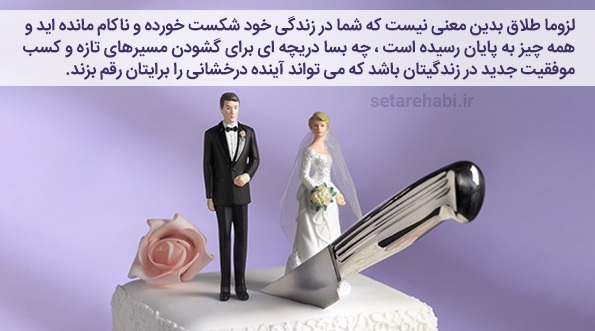 شما باید بدانید لزوما طلاق بدین معنی نیست که در زندگی خود شکست خورده و ناکام مانده اید و همه چیز به پایان رسیده است، چه بسا دریچه ای برای گشودن مسیرهای تازه و کسب موفقیت جدید در زندگیتان باشد که می تواند آینده درخشانی را برایتان رقم بزند تا بتوانید جهان را از زاویه دید کاملا جدیدی مشاهده کنید.