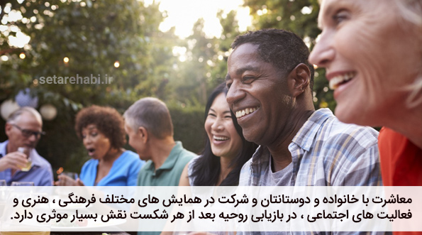 معاشرت و دورهمی های شاد با اطرافیان را قطع نکنید. سعی کنید با خانواده و دوستانتان که البته بی حاشیهتر و امنتر هستند رفت و آمد داشته باشید. معاشرت با خانواده و دوستانتان و شرکت در همایش های مختلف فرهنگی، هنری و فعالیت های اجتماعی، در بازیابی روحیه بعد از هر شکست نقش بسیار موثری دارد.