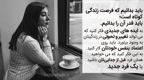 بعد از طلاق، سایه ترس روی زندگیتان گسترده شده و مدام از این میترسید که فردا چه خواهد شد. اما باید بدانیم که فرصت زندگی کوتاه است؛ باید قدر آن را بدانیم. به ایده های جدیدی فکر کنید که می تواند تغییر و تحولی در زندگیتان به وجود بیاورد. باید روی اعتماد بنفس خودتان کار کنید. به این فکر کنید که می خواهید همان فرد قبل از جداییتان باشید یا یک فرد جدید.