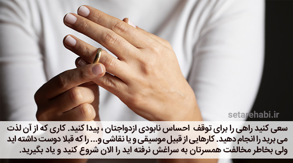 کسی که طلاق گرفته، تمام حس های بد را با تمام وجود لمس کرده است. سعی کنید راهی را برای توقف احساس نابودی ازدواجتان، پیدا کنید. دوران بعد از طلاق دوران سختی است و کمتر کسی است که بعد از طلاق بتواند زندگی عادی و روزمره خود را از سر گیرد. به همین دلیل بهتر است از یک روانشناس کمک بگیرید یا کاری که از آن لذت می برید را انجام دهید. کارهایی از قبیل موسیقی و یا نقاشی و... را که قبلا دوست داشته اید ولی بخاطر مخالفت همسرتان به سراغش نرفته اید را الان شروع کنید و یاد بگیرید.