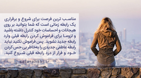 شروع یک رابطه عاطفی جدید در حین یا بلافاصله بعد از طلاق به هیچ وجه توصیه نمی شود. وقتی شما تازه از یک رابطه ناکام بیرون آمده اید نیاز به زمان کافی برای بازسازی روحی خود دارید، بنابراین مناسب ترین فرصت برای شروع و برقراری یک رابطه زمانی است که شما بتوانید بر روی هیجانات و احساسات خود کنترل داشته باشید و لزوما برای فراموش کردن رابطه قبلی وارد رابطه جدید نشوید. پس فراموش نکنید نباید رابطه عاطفی جدیدی را بهخاطر بیحس کردن خود و فرار از درد رابطه قبلی شروع کنید.