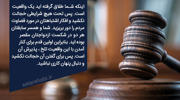 اینکه شما طلاق گرفته اید یک واقعیت است. پس تحت هیچ شرایطی خجالت نکشید و افکار اشتباهتان در مورد قضاوت مردم را دور بریزید. شما و همسر سابقتان هر دو در شکست ازدواجتان مقصر بوده اید. بنابراین اولین قدم برای کنار آمدن با این واقعیت تلخ، پذیرش آن است. پس برای گفتن آن خجالت نکشید و دنبال پنهان کاری نباشید.