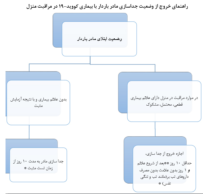 در صورتی که مادر بخواهد قبل از مدت مورد نظر از قرنطینه خارج شود می بایست دو نتیجه آزمایش منفی با فاصله حداقل 24 ساعت داشته باشد. در مورد مادران بستری در موارد شدید و بحرانی پس از 20 روز از شروع علایم می توانند از قرنطینه خارج شوند.